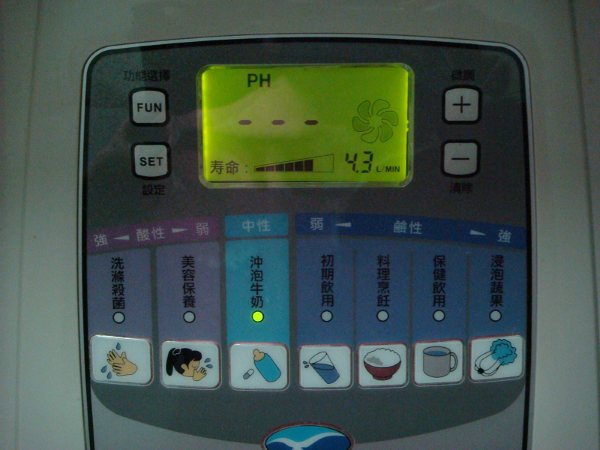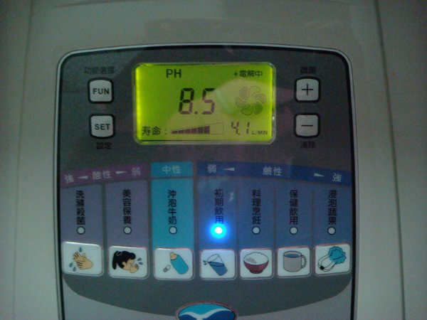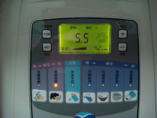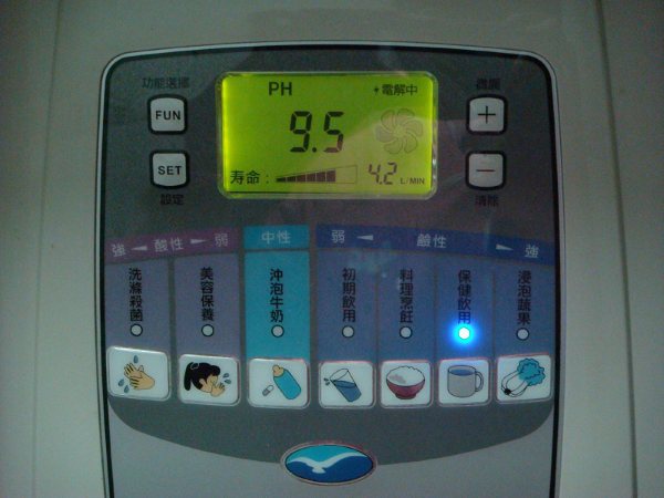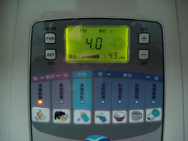 共有七段PH值設定,可自由選擇.左二個是屬酸性,使用中會持續"逼逼逼"叫聲,以提醒避免誤喝了.第一段是PH值4.0,洗滌殺菌.可用來洗手殺菌.