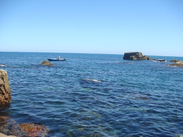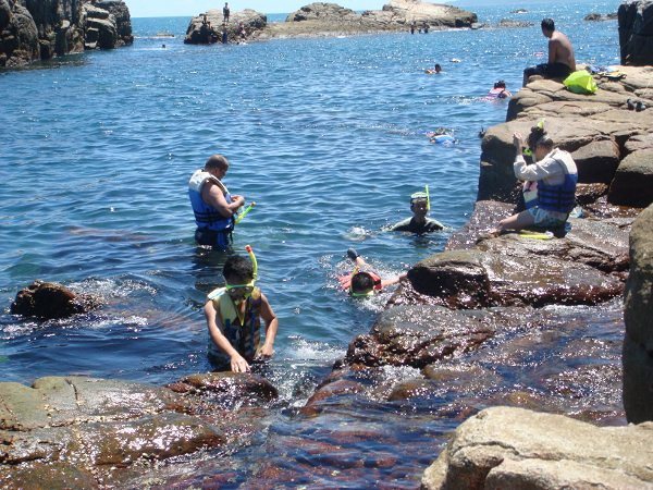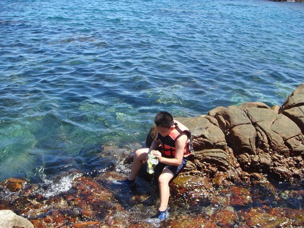 這裡四周圍都有大石頭圍住,如同一池天然泳池,比外海安全多了!看到了沒?超藍的海水.......